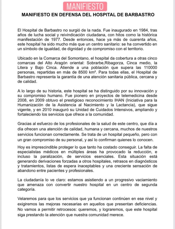 MANIFIESTO EN DEFENSA DEL HOSPITAL DE BARBASTRO