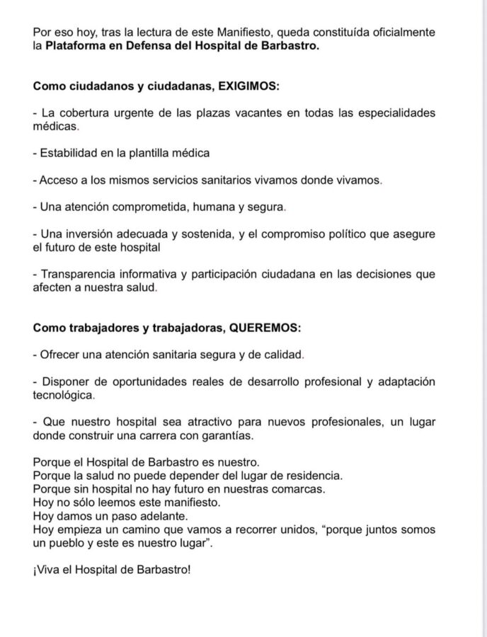 Por eso hoy, tras la lectura de este Manifiesto, queda constituida oficialmente la Plataforma en Defensa del Hospital de Barbastro.