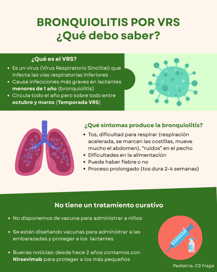 El VRS es un virus que infecta las vías respiratorias inferiores y que puede provocar cuadros graves de bronquiolitis, especialmente en lactantes menores de 12 meses. Aunque circula durante todo el año, la mayor incidencia se concentra entre octubre y marzo, conocida como la temporada VRS.