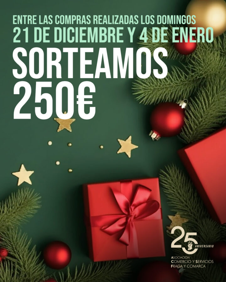 El comercio de Fraga abrirá este domingo 21 de diciembre de forma especial para facilitar las compras navideñas y fomentar el consumo local. La iniciativa, impulsada por la Asociación de Comercio y Servicios de Fraga y Comarca, permite a los clientes comprar con mayor comodidad y, además, participar en un sorteo de 250 euros en vales regalo.