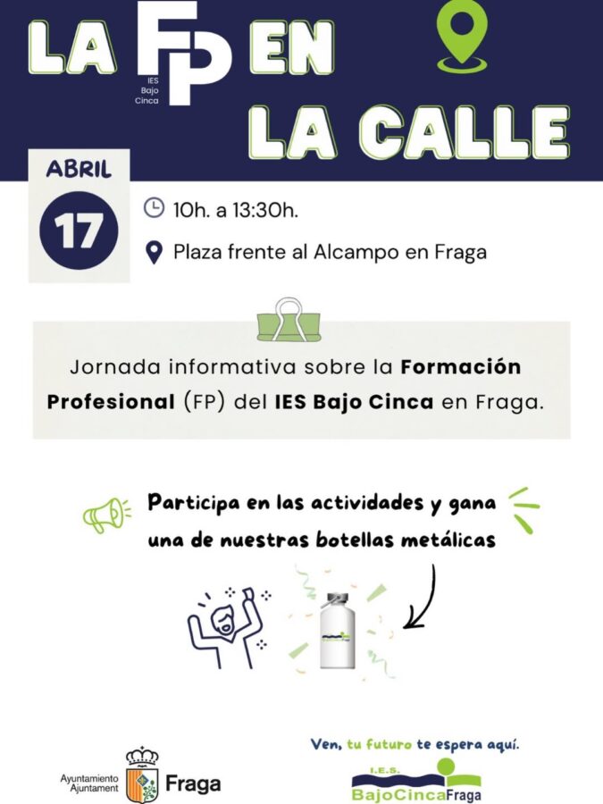 El IES Bajo Cinca dará un paso más en su apuesta por la Formación Profesional (FP) y trasladará su oferta educativa a la calle con una jornada informativa abierta a toda la ciudadanía. La iniciativa tendrá lugar el próximo 17 de abril, de 10:00 a 13:30 horas, en los Jardines de Juan Carlos I de Fraga.