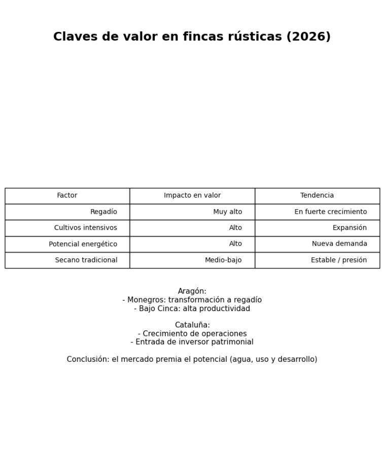 El mercado de fincas rústicas en España vive una transformación silenciosa pero profunda. Tal y como indican los expertos de Fincas Continente, lejos de depender únicamente de la rentabilidad agrícola tradicional, el valor de una finca está cada vez más ligado a factores estructurales como la disponibilidad de agua, la calidad del suelo o su potencial para usos energéticos. Una tendencia que ya se refleja en los datos de compraventa y que sitúa a Aragón y Cataluña en el radar de inversores.