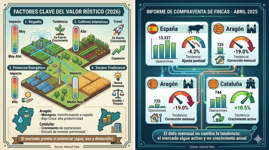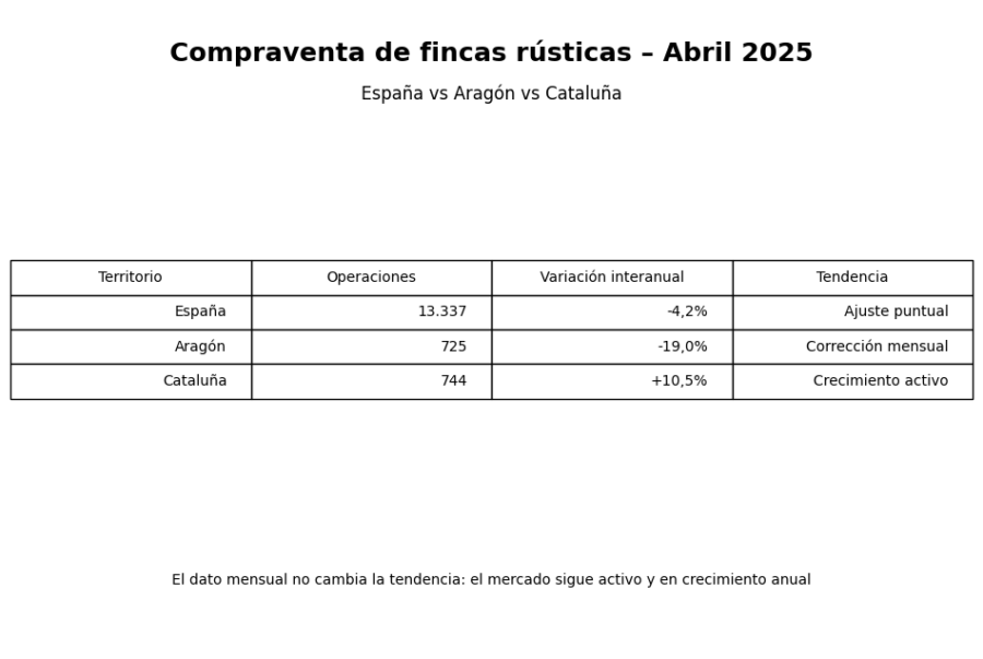 Según las últimas cifras disponibles, abril puede registrar más de 13.000 operaciones de compraventa de fincas rústicas en España, en un contexto de ligera corrección mensual pero con una tendencia anual todavía sólida. En este escenario, Cataluña destaca con un crecimiento interanual del 10,5%, mientras que Aragón, pese a una caída puntual del 19% en ese mes, mantiene un alto nivel estructural de actividad, consolidándose como uno de los territorios más dinámicos del país.