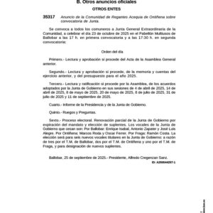 La Comunidad de Regantes Acequia de Ontiñena ha convocado una Junta General Extraordinaria para el próximo 23 de octubre de 2025, en la que se celebrará la renovación parcial de su Junta de Gobierno. La reunión tendrá lugar en el Pabellón Multiusos de Ballobar, a las 17:00 horas en primera convocatoria y a las 17:30 en segunda.
