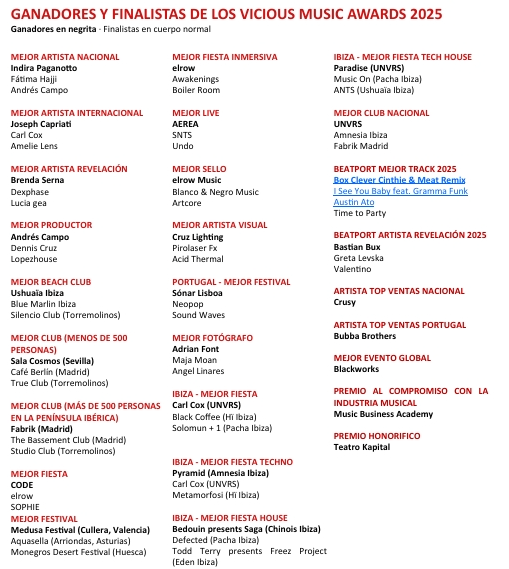 La marca elrow y el club UNVRS, impulsados por la Familia Arnau, fueron dos de las protagonistas de los Vicious Music Awards 2025 al recibir varios reconocimientos- Por su parte, elrow se llevo los premios a Mejor Fiesta Inmersiva y Mejor Sello. El club UNVRS también se llevo varios premios, sin olvidar olvidar que Andrés Campo, uno de los DJ residentes de Florida 135 y Monegros Desert Festival también alzo un galardón como Mejor Productor Nacional.