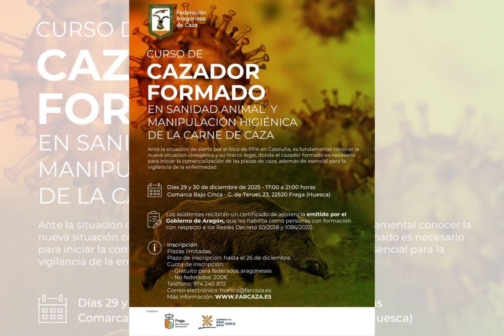 La Federación Aragonesa de Caza organizará los próximos 29 y 30 de diciembre un curso de sanidad animal y manipulación higiénica de la carne de caza en la comarca del Bajo/Baix Cinca, en colaboración con el Ayuntamiento de Fraga y la Comarca del Bajo/Baix Cinca. La formación se desarrollará en la sede comarcal, situada en la calle Conde de Teruel, 23, en Fraga, en horario de 17:00 a 21:00 horas.