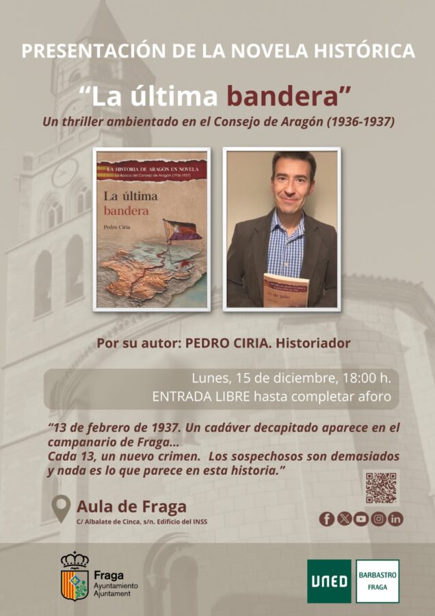 El historiador y escritor Pedro Ciria presentará su nueva novela histórica “La última bandera”, un thriller policíaco ambientado en el Consejo de Aragón (1936-1937), el gobierno anarquista que funcionó durante diez meses en la zona republicana durante el primer tercio de la Guerra Civil española.