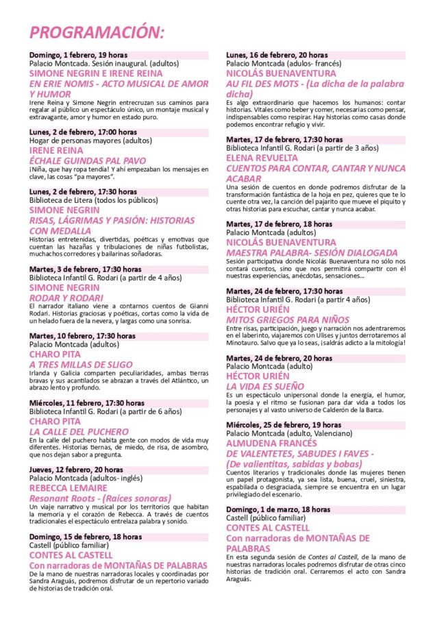 La programación se extiende a distintos espacios de la ciudad como el Palacio Montcada, la Biblioteca Infantil Gianni Rodari, la Biblioteca de Litera, el colegio de Miralsot, el Hogar de Personas Mayores y el Castell, acercando la palabra contada a públicos diversos. A lo largo del mes de febrero se sucederán propuestas como Échale guindas al pavo, de Irene Reina; Risas, lágrimas y pasión: historias con medalla y Rodar y Rodari, de Simone Negrin; o las sesiones de Charo Pita, que conectan mitología, memoria y tradición.