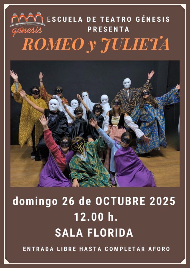 La Escuela de Teatro Génesis vuelve a subirse a los escenarios con una de las historias más universales del teatro: Romeo y Julieta, de William Shakespeare. La representación tendrá lugar el domingo 26 de octubre de 2025 a las 12.00 horas en la Sala Florida, con entrada libre hasta completar aforo.