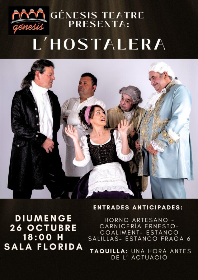 Ese mismo día, por la tarde, será el turno del grupo principal Génesis Teatre, que presentará L’Hostalera, del dramaturgo italiano Carlo Goldoni. La cita será a las 18.00 horas, también en la Sala Florida, con entradas anticipadas disponibles en los puntos de venta habituales y taquilla abierta una hora antes de la función.