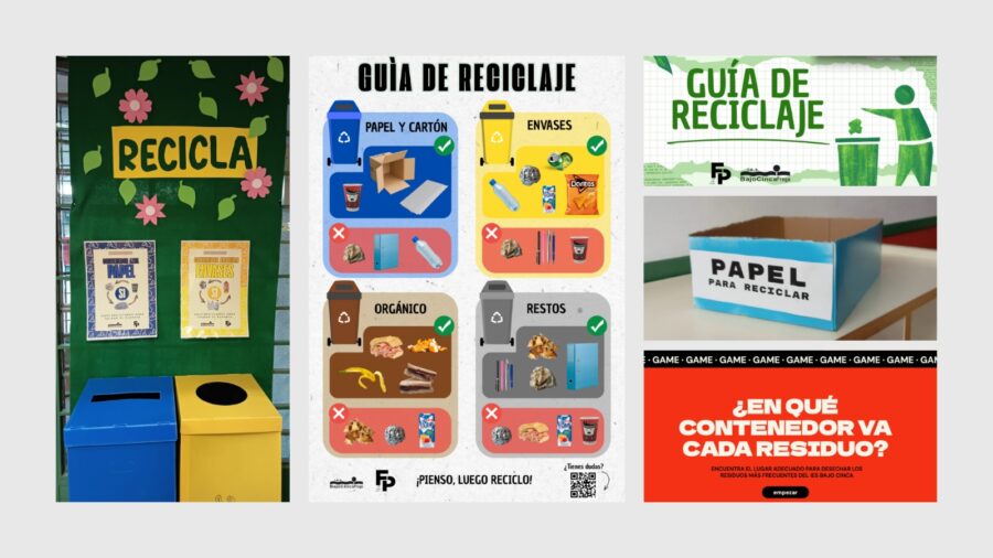 - Dinamización de los puntos de reciclaje: cada punto incluye guías rápidas con los residuos más frecuentes del instituto y se ha decorado para hacerlo más visible y atractivo para la comunidad educativa.