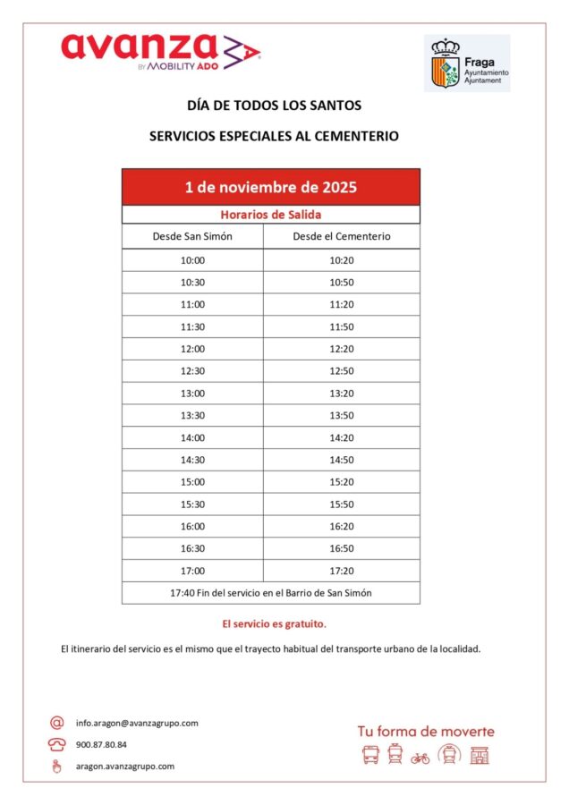El Ayuntamiento, para promover un acceso cómodo y sostenible al cementerio y reducir la congestión de tráfico, ha dispuesto un servicio especial de autobús urbano gratuito para el sábado 1 de noviembre de 2025. El servicio, que se desarrollará entre las 10:00 y las 17:40 horas, mantendrá el itinerario habitual del transporte urbano de la localidad y contará con salidas desde el barrio de San Simón y el cementerio.