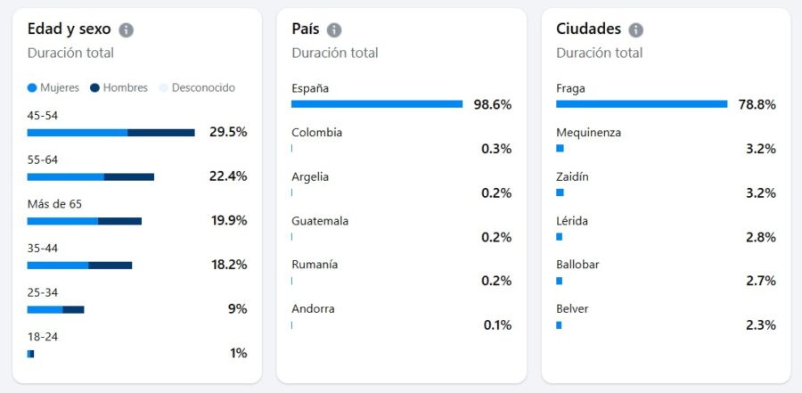 Hemos empezado el mes de diciembre superando los 1.000 seguidores en esta red social, con un carácter fuertemente comarcal. La gran mayoría de ese millar de seguidores son de Fraga y comarca, aunque también hay algunos seguidores de ciudades cercanas como Lleida, e incluso de otros países de latinoamericanos, europeos y africanos.