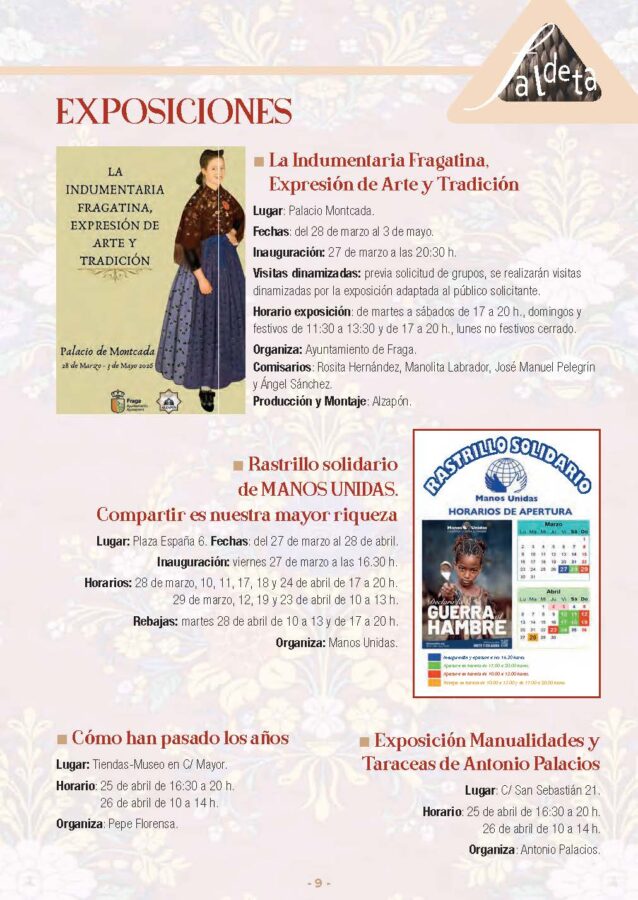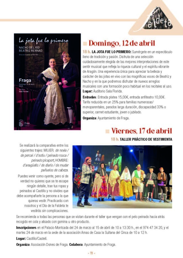La ciudad de Fraga se prepara para vivir uno de sus fines de semana más culturales y emotivos como antesala a la gran celebración del Día de La Faldeta. Tras la presentación oficial del cartel el pasado 31 de marzo, la programación coge velocidad de crucero este viernes, sábado y domingo con la mirada puesta en la exaltación de la indumentaria y las raíces fragatinas.