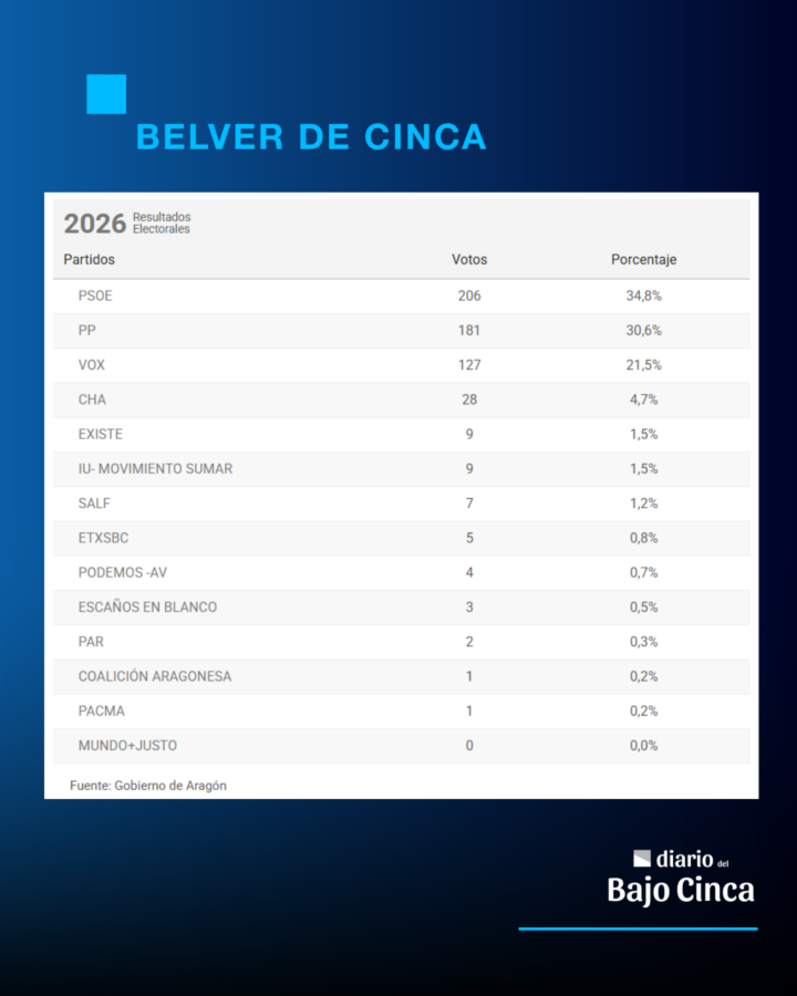 El Partido Popular es la fuerza más votada en el Bajo/Baix Cinca y se sitúa como primera opción en Fraga, Torrente, Velilla, Zaidín, Osso y Ontiñena. Por otro lado, en Chalamera, Candasnos, Belver, Ballobar y Mequinenza, es el PSOE la formación más votada.