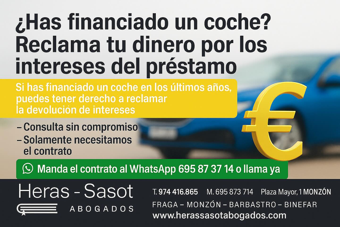 Abogados especializados en derecho bancario han empezado a tramitar este tipo de reclamaciones, y en la provincia de Huesca ya se están ofreciendo servicios de asesoramiento gratuito para estudiar cada caso. Desde el despacho Heras – Sasot Abogados, con sedes en Fraga, Monzón, Barbastro y Binéfar, explican que “si una persona que ha financiado su coche en los últimos años puede tener derecho a recuperar parte de los intereses abonados”.