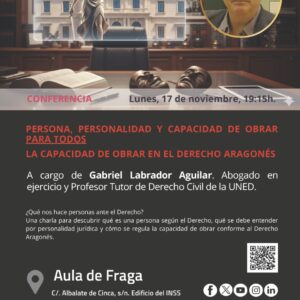 El Aula de la UNED en Fraga organizará el próximo 17 de noviembre de 2025, a las 19:15 horas, la conferencia titulada “Persona, personalidad y capacidad de obrar para todos. La capacidad de obrar en el Derecho Aragonés”, una sesión divulgativa dirigida al público general, sin necesidad de conocimientos jurídicos previos.